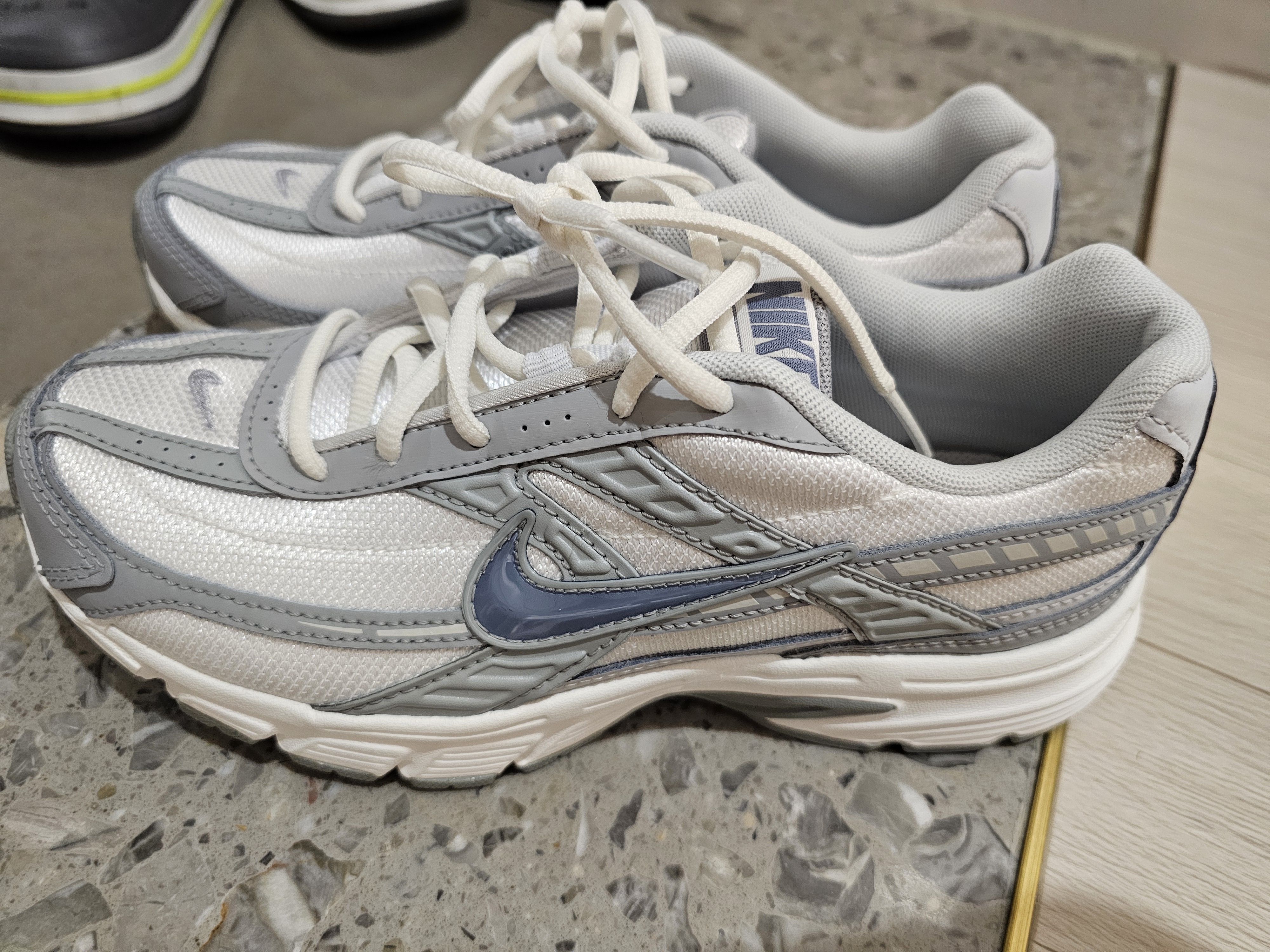 반면 나이키 이니시에이터 모델은 250 사이즈를 주문했고 반사이즈 업한 게 탁월한 선택이었어요. 칼발인 제게 딱 알맞은 핏이에요. 발 커 보이는 거 싫은데 실제 착용 느낌은 커 보이지 않아요. 투박한 느낌 없고 뉴발란스 530보다 조금 발볼이 딱 잡아주는 느낌이에요. 그렇다고 꽉 끼거나 하지 않고 사이즈 잘 맞았어요.